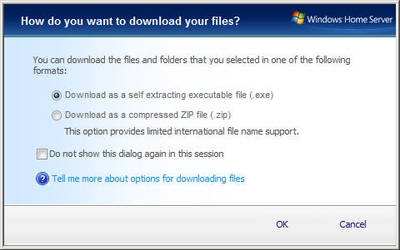 Если нужно загрузить из сервера в Internet несколько несжатых файлов, для этого может потребоваться много времени. Чтобы ускорить загрузку, WHS автоматически сжимает файлы при загрузке. Как показано на Рис. 1, сжимать файлы можно в формате .zip или в самораспаковывающемся архиве (.exe). В последнем случае можно даже обойтись без программы сжатия на ПК. Достаточно двойного щелчка на загруженном файле, и из него будут извлечены все файлы. К сожалению, одиночные файлы не сжимаются; для пересылки в сжатом формате необходимо загрузить два или несколько файлов. Похоже, это недосмотр, но данное препятствие просто обойти: установите флажок для загрузки большого файла и дополнительно отметьте другой файл, поменьше.