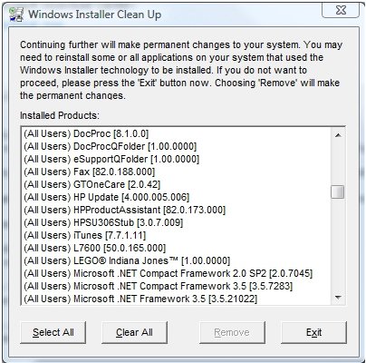 О. Компания Microsoft выпустила утилиту Windows Installer Cleanup, которую можно загрузить с Web-страницы "Description of the Windows Installer CleanUp Utility" (http://ct.email.windowsitpro.com/rd/cts?d=33-12362-791-205-68718-1284538-0-0-0-1-2-207). Утилита совместима со всеми операционными системами Microsoft от Windows Vista до Windows 95.