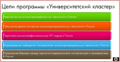 Заинтересованные коллективы вузов будут вовлечены в единую инфраструктуру взаимодействия, в рамках которой они получат доступ как к передовым аппаратно-программным технологиям, так и к компетенции ведущих научных центров. Это заложит основу для развития инновационных и научно-исследовательских проектов в вузах за счет активного использования технологий параллельных и распределенных вычислений и позволит повысить качество подготовки специалистов. Первый этап программы рассчитан на 2008-2009 годы. Для обеспечения успешной реализации программы был учрежден Наблюдательный совет, председателем которого стал Геннадий Иванович Савин. На реализацию программы компания НР выделяет более 12 млн. рублей, компания «Синтерра» – около 7 млн. рублей.