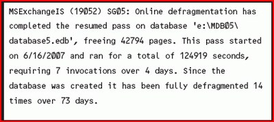 Управление дефрагментацией. Небольшое, но полезное добавление для администраторов предоставляет расширенная информация для события Event 703, которая помогает отслеживать завершение оперативной дефрагментации. В Exchange 2007 RTM это слежение представляет сложный процесс, который включает анализ журнала регистрации событий и нахождение совпадения сообщений Event 700 и Event 703 для определения, какие операции оперативной дефрагментации закончились успешно. С внедрением SP1 вся нужная вам информация содержится в Event 703. На рисунке ниже приведен пример этого сообщения.