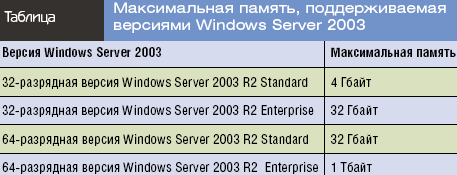 Даже если вы приобретете новое аппаратное обеспечение для сервера, нужно будет проследить за тем, достаточно ли памяти на базовом сервере для того, чтобы поддерживать гостевые виртуальные серверы. Для производственного портала SharePoint Server 2007 нужно задать конфигурацию с начальной памятью 8 Гбайт. Это позволит запустить дополнительный гостевой виртуальный сервер на базовом, если потребуется. Если вы используете VMware Server с Windows Server 2003 в качестве базовой операционной системы, убедитесь, что версия Windows Server 2003 может поддерживать тот объем памяти, который установлен на сервере. Таблица показывает различные версии Windows Server 2003 R2 и максимальный объем памяти, который поддерживает каждая из них.