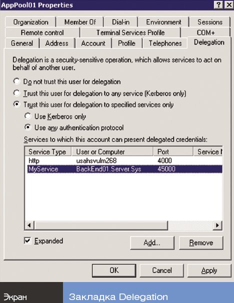 Trust this user for delegation to specified services only. Этот вариант ограничивает учетную запись пула приложений одним или несколькими целевыми объектами. Кейт Браун в книге «The.NET Developer’s Guide to Windows Security» (изд-во Addison Wesley, 2005) пишет, что этот вариант ограничивает делегирование не только по времени, но и в пространстве. Я специально говорю «целевой объект», а не «внутренняя система», потому что единственным целевым объектом ограниченного делегирования является SPN. Два типичных целевых объекта — либо компьютеры, на которых активирована запись SPN, либо пользовательские учетные записи. Если вашей целью является ограничение делегирования для внутренних систем, которые используют учетную запись пула приложений, то у вас есть выбор: можете зарегистрировать SPN для целевой учетной записи, как было описано выше, или выбрать одно из существующих SPN, заданных для целевых внутренних компьютеров.