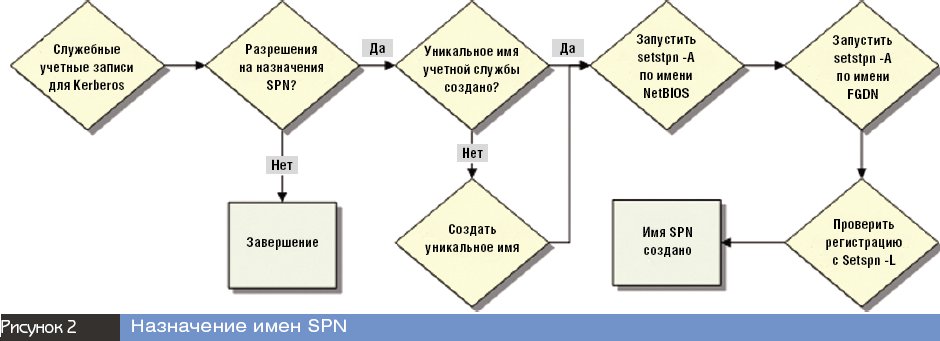 С помощью программы для командной строки setspn, которая поставляется с Windows 2003 SP1 и последующими версиями (и как дополнительный инструмент для Windows 2000), можно создавать, читать, обновлять и удалять SPN. Процесс создания относится к регистрации SPN. На рис. 2 показан процесс регистрации.