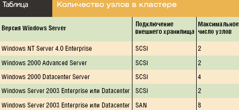 Windows NT Server 4.0 и Windows 2000 поддерживают подключение внешнего хранилища только с помощью параллельного интерфейса SCSI. Начиная с Windows Server 2003 для реализации кластерных систем полностью поддерживаются технологии SAN.