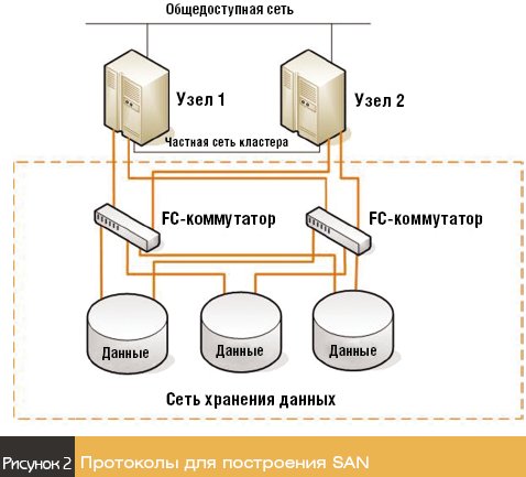 Для построения SAN технология Fibre Channel не является единственной. Сеть SAN может быть построена с применением других технологий, например iSCSI. Тема построения SAN очень обширна и выходит далеко за рамки использования продуктов Microsoft и данной статьи. Всем, кто планирует внедрение кластерных систем с использованием SAN в качестве внешнего хранилища, рекомендую обратиться к книге Дайлипа Наика «Системы хранения данных в Windows» (пер. с англ. — М.: Издательский дом «Вильямс», 2005).
