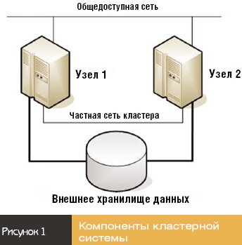 Любая отказоустойчивая система на основе MSCS включает в себя минимум два сервера, которые в терминологии кластеров называются узлами (node), и доступное обоим узлам внешнее хранилище данных (рис. 1).