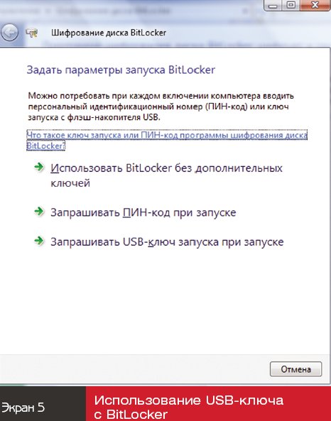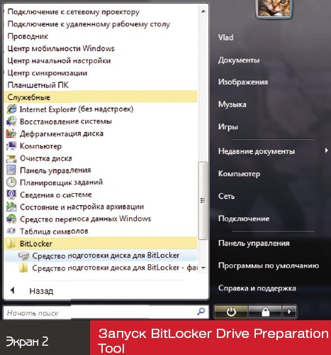 выбрать «Пуск», «Все программы», «Стандартные», «Служебные», BitLocker, «Средство подготовки диска для BitLocker» (экран 2);