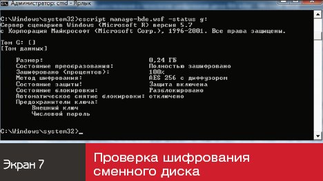 Учтите, что потребуется некоторое время для того, чтобы зашифровать сменный диск. Чтобы убедиться, что сменный диск зашифрован, введите следующую команду (экран 7):