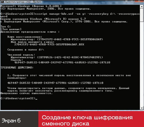 Наберите в командной строке cscript manage-bde.wsf -on R: -recoverykey d:-recoverypassword (экран 6). В данной команде используются следующие параметры: