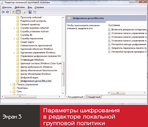 В окне «Редактор локальной групповой политики» выбрать «Конфигурация компьютера», «Административные шаблоны», «Компоненты Windows», «Шифрование диска BitLocker» (см. экран 3).