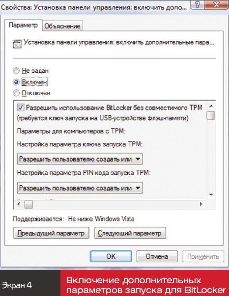 Выбрать «Включить», затем пометить «Разрешить использование BitLocker без совместимого ТРМ» (экран 4).
