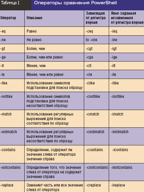 Как явствует из названия, операторы сравнения используются для сравнения значений. Когда в выражении указывается оператор сравнения, PowerShell сравнивает значение, расположенное слева от оператора, со значением, стоящим справа от него. Вспомним приведенный выше пример, где значение свойства Length сопоставлялось со значением 500 000. Как показано в табл. 1, в среде PowerShell реализовано множество операторов сравнения. Возьмем некоторые из них и посмотрим, как они работают.