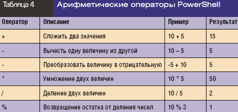 PowerShell допускает использование арифметических операторов для выполнения математических вычислений. В табл. 4 даются описания этих операторов и приводятся базовые примеры. Некоторые из этих операторов можно использовать не только для выполнения математических вычислений, но и для решения других задач. Так, оператор «+» можно применять для сцепления строковых значений: