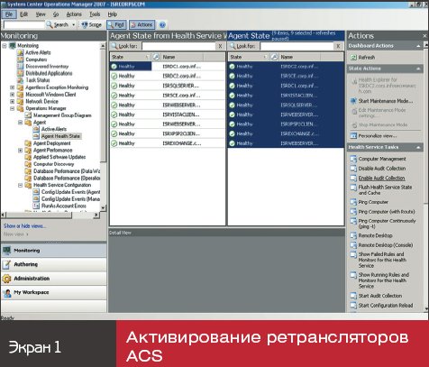 После установки коллектора нужно активировать ретрансляторы ACS. Это можно сделать из консоли Operations диспетчера Operations Manager 2007. Запустите консоль, затем нажмите кнопку Monitoring. Если необходимо, разверните узел Monitoring, а затем узлы Operations Manager и Agent, и щелкните Agent Health State. В центре консоли Operations Manager находятся две панели со списками компьютеров. В правой панели нужно выбрать компьютеры, которые должны быть ретрансляторами, затем выбрать команду Enable Audit Collection в области Health Service Tasks раздела Actions, как показано на экране 1.