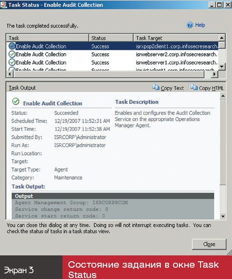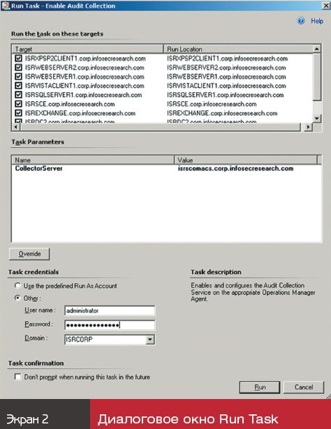 Когда откроется диалоговое окно Run Task — Enable Audit Collection, щелкните на кнопке Override. В окне Override Task Parameters выберите столбец New Value строки CollectorServer. Введите полное имя FQDN сервера коллектора и щелкните на кнопке Override. Затем в диалоговом окне Run Task в разделе Task Credentials выберите Other и введите учетные данные пользователя домена, имеющего административные права на каждом компьютере, настроенном в качестве ретранслятора ACS. Окно Run Task будет выглядеть примерно так, как показано на экране 2. Щелкните на кнопке Run, чтобы начать активизацию служб ACS. Состояние задания отображается в диалоговом окне Task Status (см. экран 3).