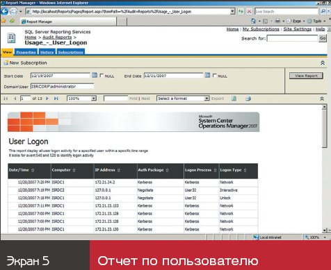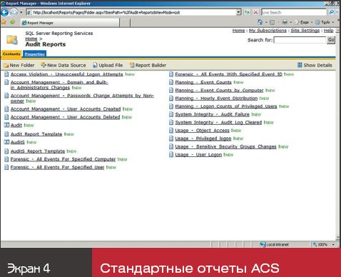 Хотя в консоли Operations Manager Operations Console имеется кнопка Reporting для настройки отчетов и просмотра ограниченной информации, все отчеты ACS отображаются в браузере. Нужно открыть браузер, перейти к адресу http://reportserverurl/Reports и щелкнуть на папке Audit Reports.