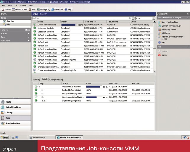 Еще одно достоинство архитектуры, построенной вокруг оболочки PowerShell, проявляется в работе диспетчера SCVMM, который ориентирован на выполнение заданий. Когда администратор осуществляет какие-либо действия, выполняется определенный сценарий, после чего, как показано на экране, выполнение сценария отслеживается и регистрируется в представлении Jobs консоли VMM как выполненное задание. Если задание завершается с ошибкой, его можно выполнить повторно.