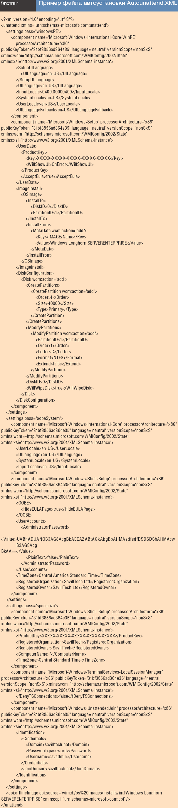 В документации WAIK содержится детальное описание минимальных требований, которые необходимо определить для автоматизированной установки. В листинге приведен пример файла autounattend.xml, обеспечивающего разбивку диска на разделы и установку полной версии Server 2008 Enterprise. Чтобы воспользоваться этим файлом, необходимо задать ключ продукта и значение пароля локального администратора через Windows System Image Manager, поскольку пароль локального администратора зашифрован. Заметим, что есть и другие возможности — например, система управления ключами, — не требующие передачи ключа продукта в файл autounattend.xml.