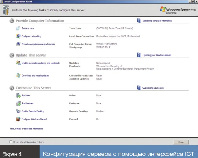 Как мы видим на экране 4, интерфейс ICT проводит пользователя через все основные этапы настройки сервера, где выполнена новая установка Server 2008. На экране отображаются текущие значения, а щелчок на очередном элементе открывает соответствующий компонент панели управления для задания нужного значения. Например, если выбран значок для установки имени компьютера и домена, автоматически открывается компонент «Система» панели управления.