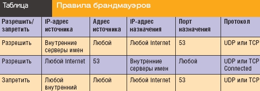 В таблице показан набор правил брандмауэра, которые позволяют определить набор внутренних серверов имен, имеющих право обращаться к серверам имен в Internet (и получать ответы), но блокируют запросы, исходящие непосредственно из внутренних распознавателей к серверам имен в Internet. Если возможно, брандмауэр должен также применять фильтрацию пакетов UDP в контексте протокола и состояния соединения, чтобы принимать датаграммы UDP только из таких IP-адресов серверов имен в Internet, к которым недавно обращался внутренний сервер имен.