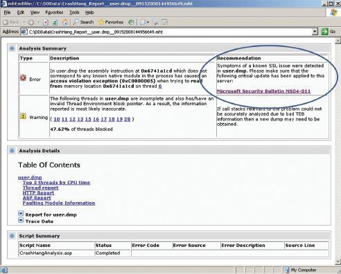 Нажмите кнопку Start Analysis, чтобы выполнить выбранный сценарий. DebugDiag показывает результаты анализа и автоматически сохраняет аналитический отчет в папке DebugDiagReports и открывает его в Internet Explorer. Этот отчет имеет три главных раздела: