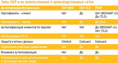 Исправленный стандарт IEEE 802.11 (включая поправку 802.11i) не содержит обязательного указания на то, какой тип протокола EAP следует применять. Но этот стандарт рекомендует использовать такой тип EAP, который поддерживает взаимную аутентификацию, позволяющую реализовывать соединения Robust Security Network Associations (RSNA) — логические соединения между беспроводными клиентами и точками доступа сетевой инфраструктуры. В таблице сопоставляются различные типы EAP, сравниваются их возможности и приводятся рекомендации относительно того, следует ли применять эти типы в производственных сетях.