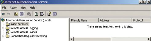 Если вас устраивают применяемые по умолчанию настройки регистрации, первое, чем следует заняться, — это настройка клиентов сервера RADIUS или IAS. Возможно, вы склонны рассматривать клиентов в качестве конечных узлов сети, но не забывайте, что при аутентификации на базе службы RADIUS используются другие архитектуры. Конечные узлы подключаются к точкам доступа в качестве клиентов, и точки доступа подключаются к серверу RADIUS как клиенты. Поэтому клиентами, которые необходимо настраивать в IAS, являются точки доступа, используемые в беспроводных локальных сетях.