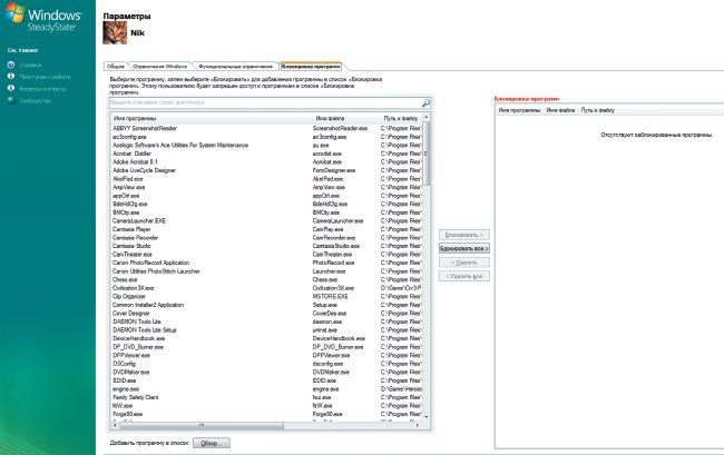 на вкладке «Запрещенные программы» нажмите кнопку «Обзор» и выберите bubble.exe. В левом списке программ выберите «Всплывающие сообщения Windows SteadyState» и нажмите кнопку «Блокировать». Это позволит предотвратить сохранения изменений в файле кэша (который будет удален защитой диска Windows) пользователем с ограниченными правами администратора;
