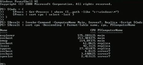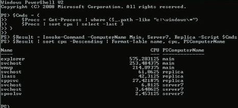 Как показано на экране 3, можно передавать сразу несколько команд в одном блоке, помещать их результаты выполнения на нескольких компьютерах в переменную, а затем обрабатывать на рабочей станции, используя возможности Windows PowerShell по работе с объектами.