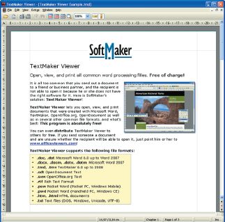 Бесплатная версия TextMaker Viewer 2009 — это универсальная программа для просмотра документов, созданных во всех распространенных текстовых редакторах и впервые с поддержкой формата DOCX. Помимо файлов формата DOCX, программа TextMaker Viewer 2009 также открывает, отображает и печатает файлы в форматах DOC (от Microsoft Word 6.0 до Microsoft Word 2003), OpenDocument, HTML, RTF и TextMaker.tmd. Программа TextMaker Viewer 2009 создана на базе технологии, которая будет применяться в готовящемся к выпуску мультиплатформенном текстовом процессоре SoftMaker TextMaker 2009.