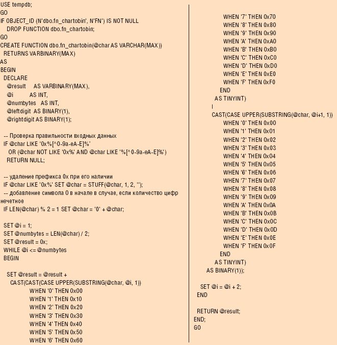 Но если вы хотите иметь возможность выполнять преобразование в запросе к таблице, придется реализовать его в виде UDF. Для этой цели можно использовать функцию fn_chartobin, представленную в листинге 3.