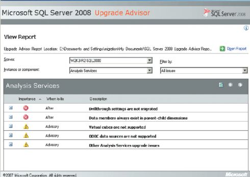Программа SQL Server 2008 Upgrade Advisor, которую можно установить с носителя SQL Server 2008, позволяет следить за состоянием обновления процессора базы данных, SSAS, служб SQL Server 2005 Reporting Services и SQL Server Integration Services (SSIS), а также DTS.?Такие компоненты, как .NET Framework 2.0 и Windows Installer 4.5, автоматически устанавливаются до того, как пользователь сможет запустить программу Upgrade Advisor,?— если они еще не установлены в среде Windows 2003.