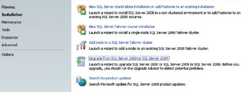 2. Нажмите кнопку Installation и выберите элемент Upgrade from SQL Server 2000 or SQL Server 2005. Программа установки проверит, соответствует ли главный сервер SQL Server 2000 минимальному набору требований для установки. Если на данном этапе программа обнаружит какую-либо проблему, следует остановить работу установщика, решить проблему и вновь приступить к модернизации.