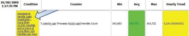 Клиент устранил проблему путем перезагрузки сервера, который после этого вновь стал участвовать в транзакциях BizTalk. Но нам нужно было понять, что же вызвало сбой. Мы начали с того, что запустили журнал Performance Monitor непосредственно после перезагрузки. Получив данные о производительности, мы скопировали файл .blg на рабочую станцию для анализа, затем передали этот файл мастеру PAL для формирования отчета по результатам анализа. Поскольку ошибка в журнале регистрации указывала, что система испытывала нехватку пула невыгружаемой памяти, мы прокрутили содержимое вниз и в разделе отчета, посвященном памяти, увидели тревожные оповещения, в том числе сообщения 31 Handle Leak Detection, как показано на экране 2.