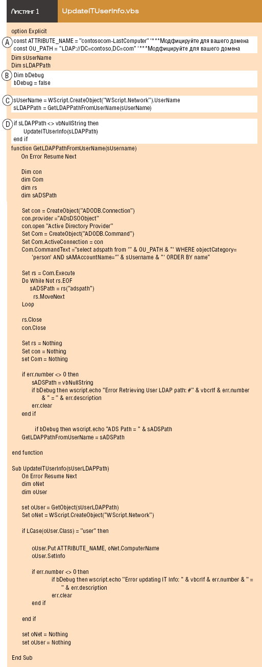 Чтобы обновить пользовательский объект в каталоге Active Directory, добавив имя компьютера, на котором пользователь регистрируется в данный момент, выполните сценарий UpdateUserInfo.vbs, приведенный в листинге 1. Этот сценарий берет имя пользователя, находит в Active Directory путь к пользовательскому объекту и обновляет атрибут (скажем, contosocom-LastComputer) для пользователя, выполняющего процедуру регистрации. Во фрагменте A я задаю константу для атрибута LastComputer и другую константу — для пути к организационной единице (Organizational Unit, OU). Вам придется модифицировать сценарий с учетом своей среды.