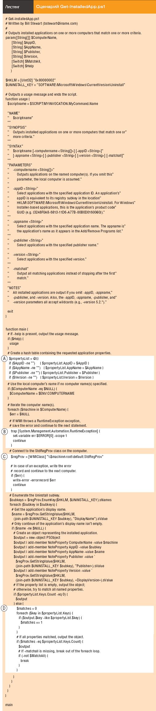 Теперь, когда вы знаете, как пользоваться сценарием Get-InstalledApp.ps1, давайте посмотрим, каким образом он функционирует. Сначала с помощью команды param сценарий объявляет параметры командной строки; затем он создает две глобальные переменные для использования в дальнейшем при работе с классом StdRegProv. После этого сценарий объявляет функцию usage и главную функцию. Последняя строка сценария вызывает главную функцию.
