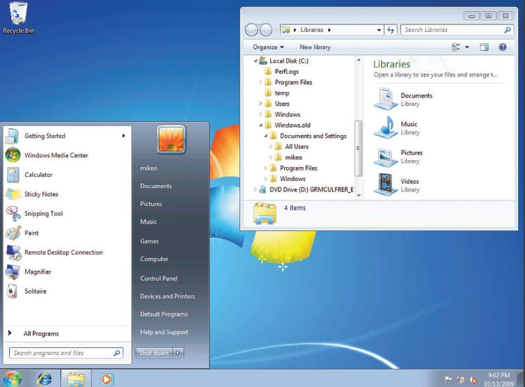 После завершения установки появляется рабочий стол Windows 7, показанный на экране 3. Обратите внимание на новую панель задач Windows 7 в нижней части экрана. В нижней правой половине экрана находится Windows 7 Explorer с новым компонентом Libraries. В расположенном рядом древовидном представлении показан каталог Windows.old с вложенными каталогами Documents and Settings, Program Files и Windows. В них сохранены системные файлы и приложения XP.