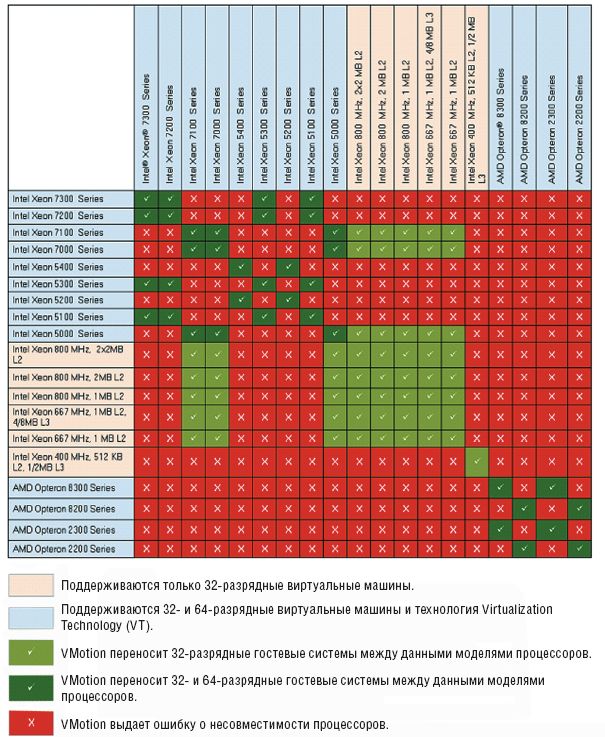 Возможность динамической миграции между хостами Hyper-V на базе процессоров AMD и Intel не предусмотрена. Теоретически перенос «гостей» виртуальных серверов с одного хоста Hyper-V на другой возможен, если эти хосты строятся на базе процессоров одного семейства; можно также повысить уровень совместимости между хостами для выполнения функции Live Migration за счет перехода в режим совместимости процессоров. Хотя в таблице представлены данные для продукта VMotion компании VMware, она дает общее представление о том, какие семейства процессоров обладают взаимной совместимостью и обеспечивают выполнение функции Live Migration.