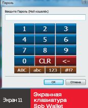 В разделе «Настройки» вы можете изменить настройки безопасности, после которых ваш кошелек будет закрыт. В случае если вы захотите использовать для настройки или просмотра сведений свой компьютер, потребуется ввести ваш пароль доступа при помощи экранной клавиатуры (экран 11).