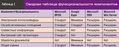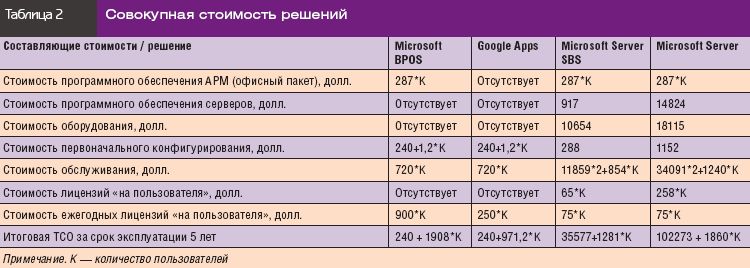 Это решение размещается на собственной аппаратной инфраструктуре. В исследовании в качестве аппаратной платформы мы рассматривали сервер Hewlett-Packard ML370 T05 (стоимостью около 10 000 долл.). Общая стоимость ПО для 70 пользователей — около 25 000 долл. Решение, в частности, предоставляет следующие функции: электронной почты (Exchange Server), совместной работы с документами (SharePoint Services), защиты сообщений (Microsoft Forefront Security). Подробнее о данном решении рассказано здесь: http://download.microsoft.com/download/B/8/A/B8A6537E-A709-414C-9F5D-0EAE781A6F6D/SBS%202008_Datasheet.pdf.