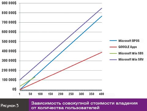 Решение от Google остается вне конкуренции по стоимости. А вот онлайн-решение от Microsoft становится дороже, чем решение на собственной инфраструктуре, уже для 85 пользователей. В этих же условиях SBS «побеждает» BPOS уже на количестве 33 пользователя.