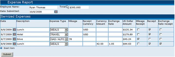 На экране 1 показана форма о расходах InfoPath, которая может выводить текущие курсы обмена, суточные при командировках и т. д., затем подсчитывать их и автоматически вводить в качестве элементов строк. Форма также может вести поиск по информации пользователя, затребовать исключительного использования и т. д.