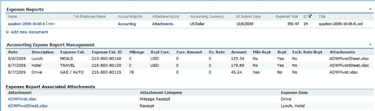 Поскольку отчеты о расходах добавляются в библиотеку форм, к ней может быть прикреплен код для того, чтобы вести поиск по данным формы и настраивать разрешения, если необходимо. Код может извлекать специфические элементы данных и передавать эти данные в локальные или внешние приложения, основываясь на правилах бухгалтерского учета. Хотя этот шаг и необязателен, он добавляет важные возможности всему приложению, и здесь как раз можно вставить какой-либо несложный пользовательский код в виде части приложения.