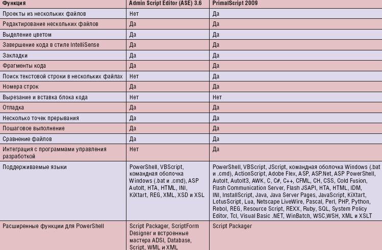 Выбор редактора. Оба рассматриваемых редактора великолепны и разрывают все ограничения, связывающие нас при создании сценариев PowerShell с помощью редактора Notepad. Однако, на мой взгляд, победителем состязания должен стать редактор PrimalScript 2009. Интерфейс PrimalScript понравился мне больше. Хотя данный пакет имеет менее функциональные средства генерации кода, он обеспечивает поддержку работы с проектами и содержит широкий набор фрагментов кода, а механизмы отладки (хотя и предоставляют только базовые возможности) вполне работоспособны. Вместе с тем стоит заметить, что я опытный разработчик, создающий приложения и сценарии в течение нескольких лет, и, соответственно, знаком со множеством технологий и языков создания сценариев. Для администраторов Windows, не работавших с инструментами Windows Management Instrumentation (WMI), Active Directory Service Interfaces (ADSI) и PowerShell, возможно, более важным фактором станет наличие в редакторе ASE широкого набора мастеров создания кода (в том случае, если не требуется поддержка системы Windows 7).