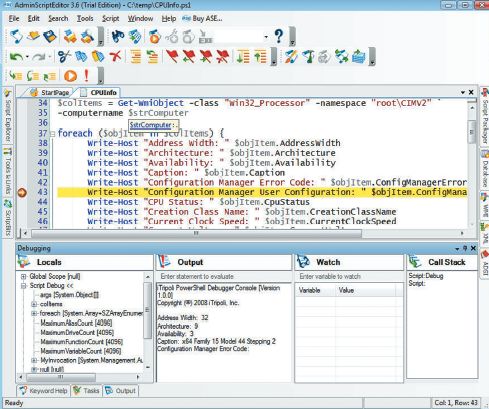 Редактор ASE имеет мощный механизм отладки. Щелчок мышью на значке Active Debugger запускает отладчик сценариев PowerShell. Панель отладки, представленная в нижней части экрана 1, отображает значение локальных переменных, выходных данных сценариев, видимых переменных, а также значения стека вызовов. Отладчик позволяет указывать множество точек прерывания, щелкая мышью по правой границе окна редактирования. Наведя указатель мыши на переменную, вы сможете увидеть ее значение.