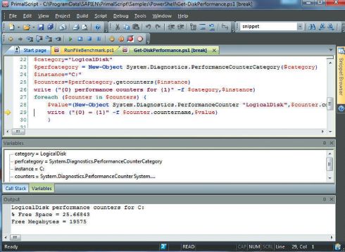 Функции, предлагаемые редактором PrimalScript для отладки сценариев PowerShell, не выходили за рамки базовых возможностей, но оказались вполне достаточными. К сожалению, щелчок мышью на полях не привел к ожидаемому результату в виде создания точки прерывания. Вместо этого мне пришлось переключаться между точками прерывания с помощью клавиши F9. Исполнение сценариев в режиме отладки работает без ошибок, проблем с подписями или другими параметрами не возникает. Функция Set Arguments позволяет задать значения аргументов командной строки для отлаживаемого сценария. Отладчик позволяет осуществлять пошаговое выполнение, при этом значения переменных сценария отображаются в окне Variables. Возможности изменения значений переменных и просмотра значения переменной путем наведения на нее курсора мыши отсутствуют.