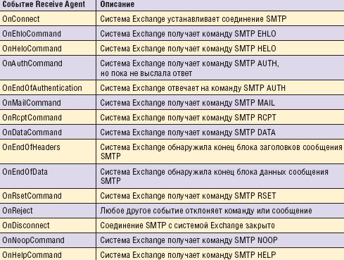 В ходе разработки Exchange 2007 специалисты Microsoft переписали транспортную систему «с нуля». Теперь управление механизмом SMTP и обработкой сообщений осуществляется с помощью службы Microsoft Exchange Transport Service (MSExchangeTransport.exe), встроенной в Exchange. Новая архитектура позволяет агентам последовательно обращаться к потоку SMTP при обнаружении определенных событий. События SMTP Receive Agent представляют собой различные команды и процессы в диалоге SMTP. В таблице 1 представлены различные события в том порядке, в котором они появляются в ходе транзакции SMTP.