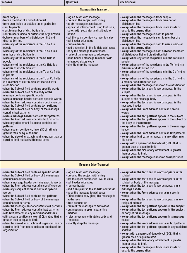 Правило транспорта состоит из трех компонентов: условия, исключения и действия. Условия и исключения иногда называют предикатами. Таблица 2 содержит список предикатов и действий, доступных при создании правил для серверов Edge Transport и Hub Transport. Правила Hub Transport имеют больше параметров, обеспечивающих дополнительный контроль потока сообщений. Правила Edge Transport анализируют свойства сообщений и определяют действие, которое необходимо совершить над письмом: пропустить, исправить или запретить пересылку.