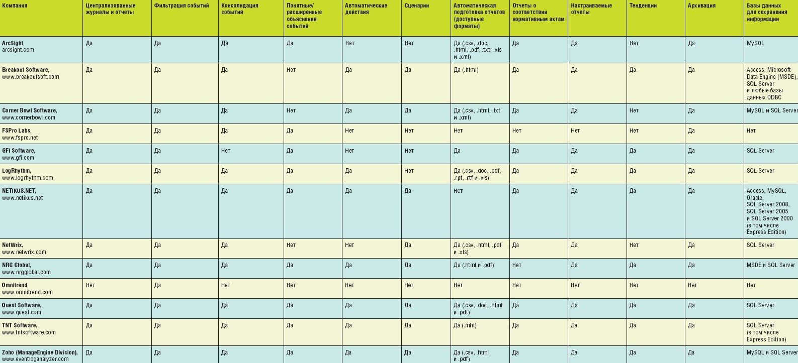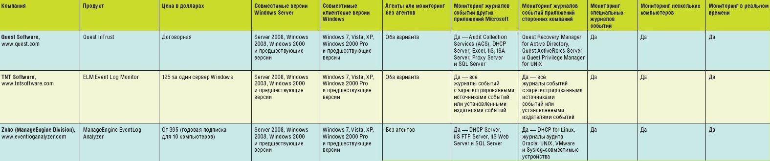 Поскольку все диспетчеры в данном обзоре работают с указанными журналами, они отдельно в таблице не отмечены. Зато уделено внимание возможности проверять дополнительные журналы событий, такие как журналы событий других приложений Microsoft (например, Exchange Server, SQL Server), сторонних приложений (IBM WebSphere, DHCP for Linux) и специальные журналы событий.