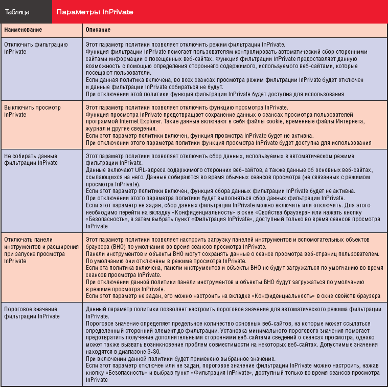 Данная функция предлагает пользователю дополнительные средства контроля над сторонними узлами, которым он согласен передавать данные о своем поведении в Интернете. Пользователи часто не обращают внимания на то, что фрагменты содержимого, некоторые изображения, рекламные объявления и аналитические данные предоставляются сторонними узлами и что эти узлы имеют возможность отслеживать поведение отдельного пользователя на различных сайтах. Фильтрация InPrivate дает пользователю дополнительные средства контроля над тем, какую именно информацию сторонние веб-узлы смогут использовать для отслеживания поведения в сети. Управлять режимом InPrivate можно с помощью параметров групповой политики, описанных в таблице и настраиваемых в разделе Конфигурация компьютера\Административные шаблоны\Компоненты Windows\Internet Explorer\InPrivate. Эта информация предназначена в первую очередь для администраторов общедоступных компьютеров.